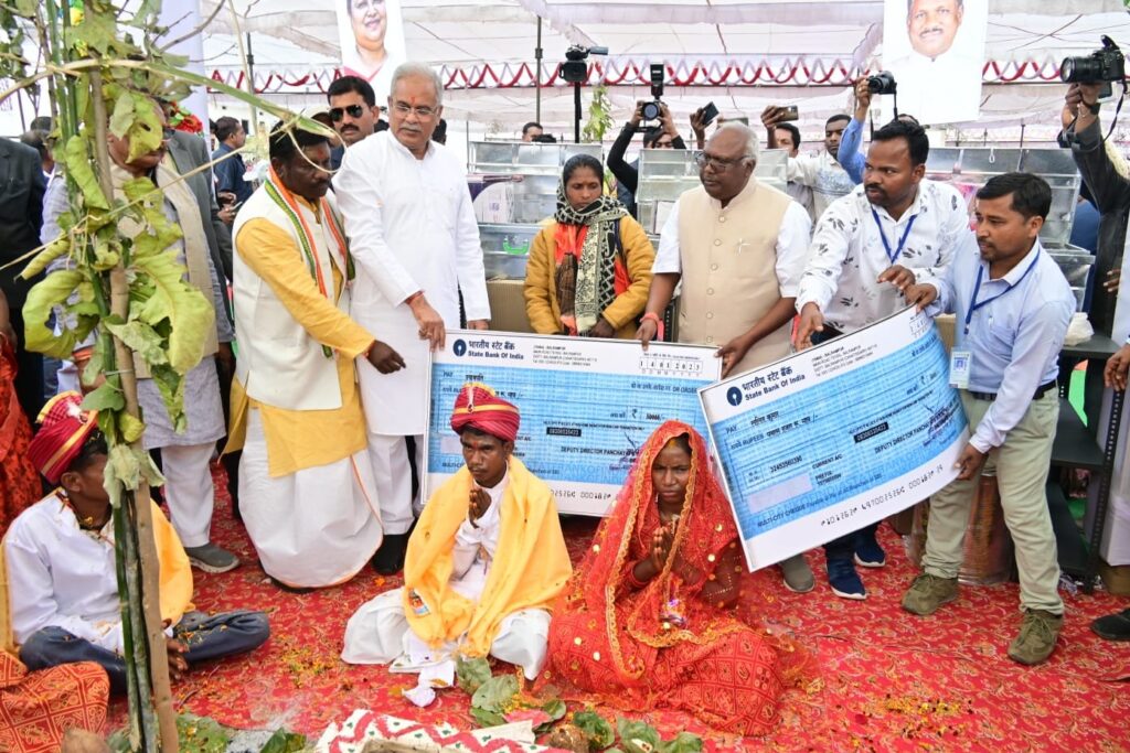 सामूहिक कन्या विवाह में शामिल हुए मुख्यमंत्री श्री भूपेश बघेल :- मुख्यमंत्री श्री भूपेश बघेल ने तातापानी महोत्सव में मुख्यमंत्री सामूहिक कन्या विवाह योजनांतर्गत कराये गये 501 नव दंपत्तियों को आर्शीवाद देते हुए उनके उज्ज्वल भविष्य की कामना की।