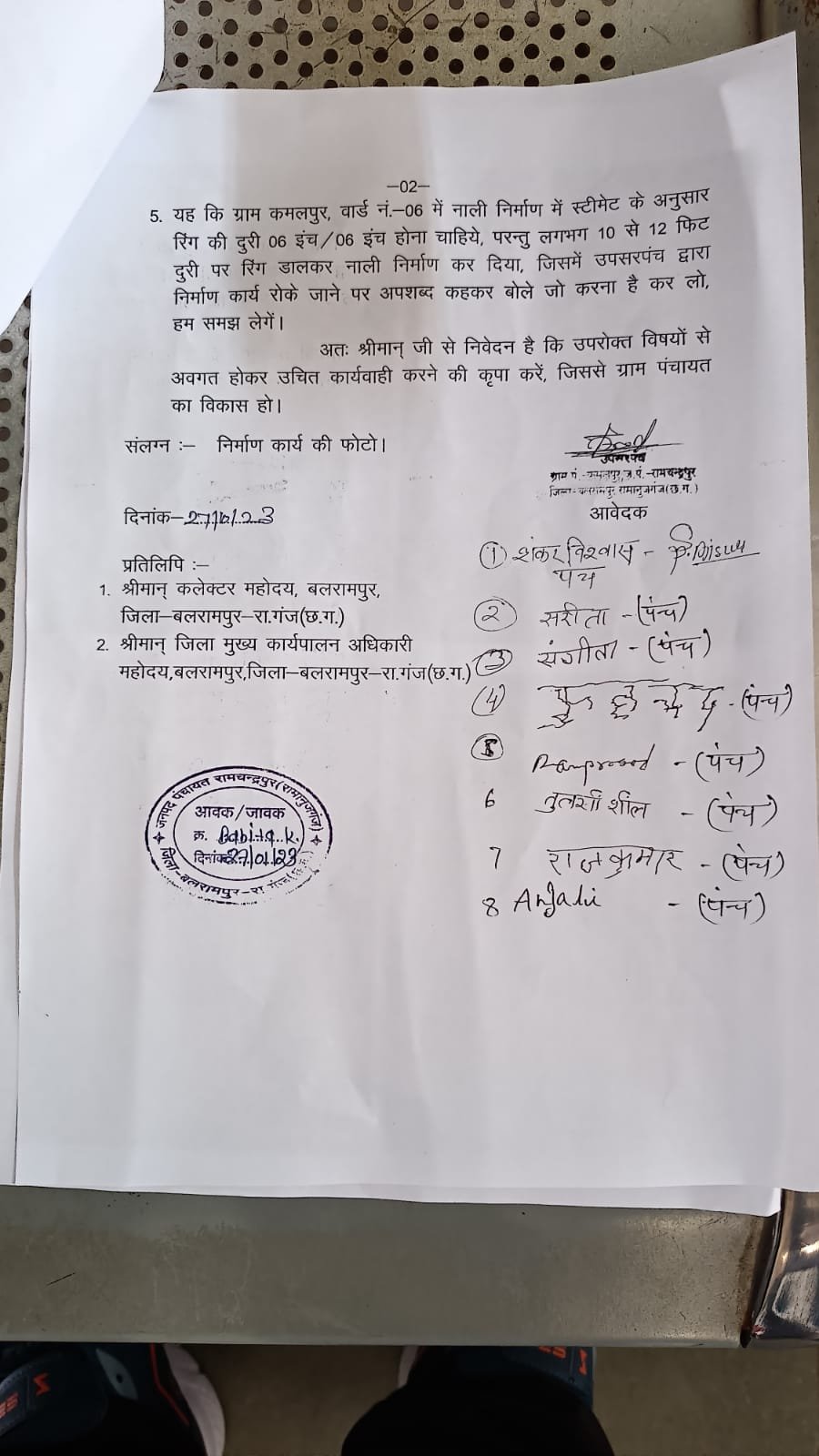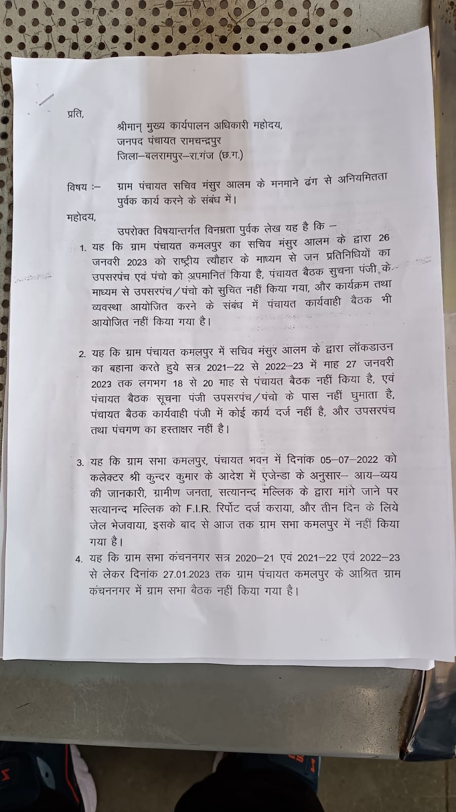 आरोप लगाया कि सचिव के द्वारा लॉकडाउन का बहाना बनाते हुए पिछले 18-20 महिने से पंचायत का बैठक नहीं किया गया है तथा उप सरपंच और पंच गण का कोई हस्ताक्षर नहीं है.