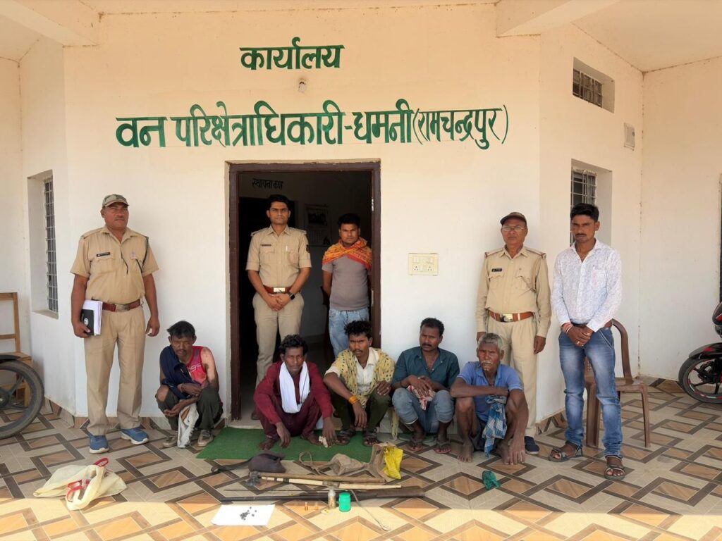 वन विभाग को गुप्त सूचना मिली थी कि कुछ लोग जंगल में हथियार लेकर शिकार की नीयत से घूम रहे हैं। सूचना के आधार पर टीम ने तत्काल कार्रवाई करते हुए इलाके में घेराबंदी की। सर्च ऑपरेशन के दौरान 5 आरोपियों को मौके से पकड़ लिया गया, जबकि एक आरोपी अंधेरे और जंगल का फायदा उठाकर फरार हो गया।