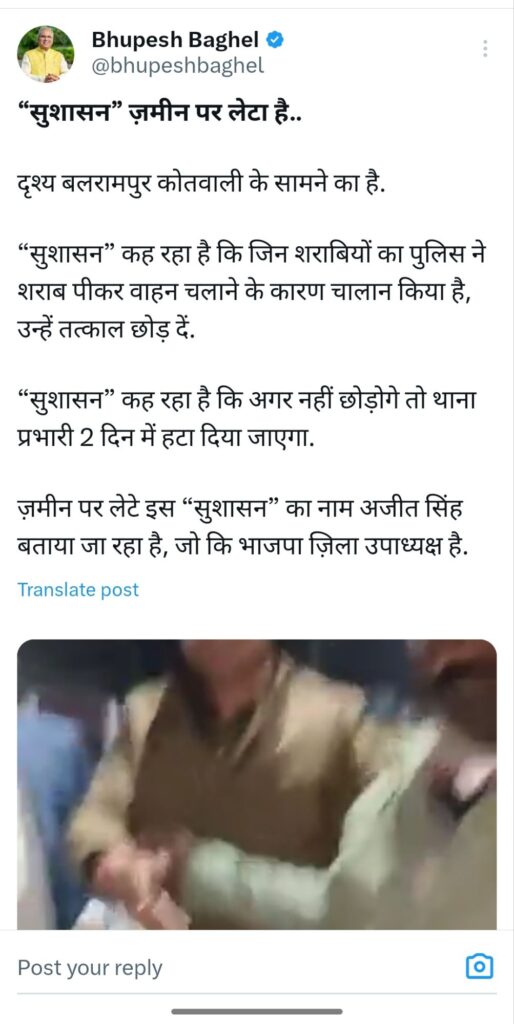 इस घटना पर पूर्व छत्तीसगढ़ सीएम भूपेश बघेल ने चुटकी लेते हुए कहा, “सुशासन जमीन पर लेटा है।” उन्होंने यह बयान अपने आधिकारिक ट्विटर हैंडल पर वीडियो साझा करते हुए लिखा। बघेल के इस बयान ने राजनीतिक हलकों में नई चर्चा छेड़ दी है।