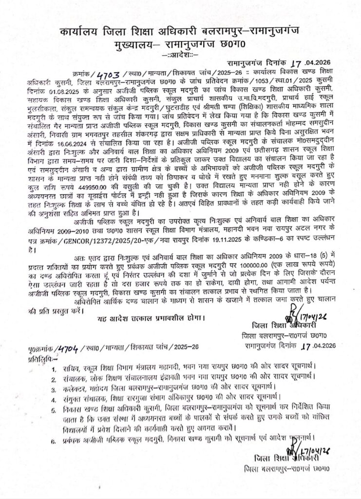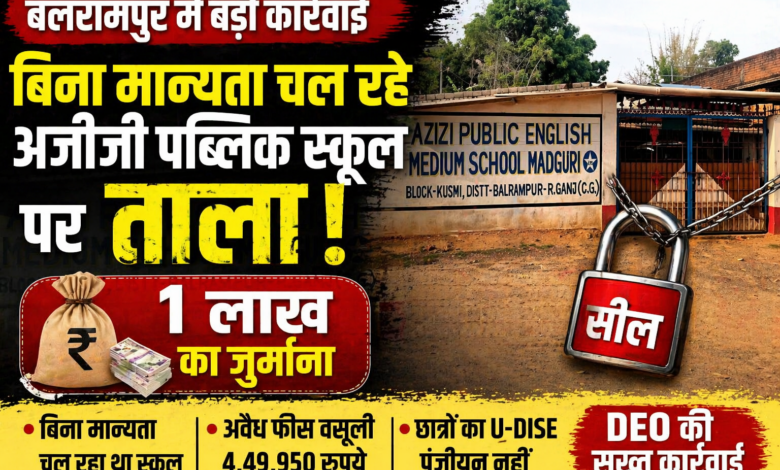 बलरामपुर जिले में शिक्षा विभाग ने बड़ी कार्रवाई करते हुए मदगुरी क्षेत्र में संचालित अजीजी पब्लिक स्कूल को तत्काल प्रभाव से बंद करने का आदेश जारी कर दिया है। जिला शिक्षा अधिकारी (डीईओ) द्वारा जारी आदेश में स्कूल प्रबंधन पर एक लाख रुपये का जुर्माना भी लगाया गया है। यह कार्रवाई स्कूल के बिना शासकीय मान्यता के संचालन, असुरक्षित भवन और नियमों के गंभीर उल्लंघन को लेकर की गई है।