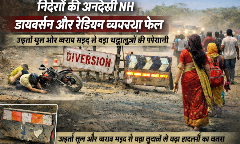 कलेक्टर के निर्देशों की अनदेखी NH डायवर्सन और रेडियम व्यवस्था फेल, उड़ती धूल और खराब सड़क से बढ़ा श्रद्धालुओं की परेशानी