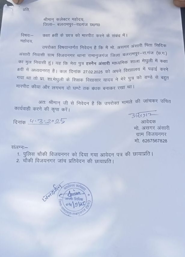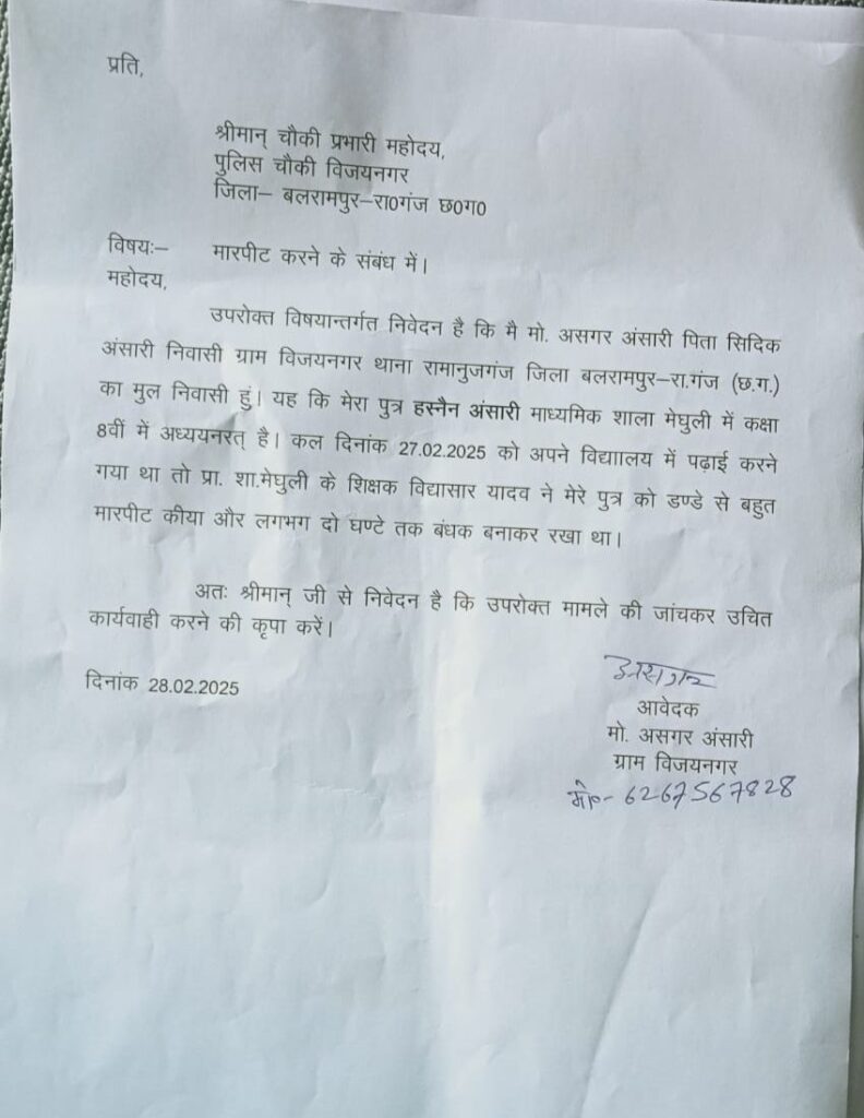 बलरामपुर जिले के माध्यमिक शाला मेघुलि में पढ़ने वाले एक नाबालिग छात्र के साथ हुई क्रूरता ने शिक्षा विभाग और पुलिस प्रशासन की कार्यप्रणाली पर गंभीर सवाल खड़े कर दिए हैं। आरोप है कि प्राथमिक शाला मेघुलि के शिक्षक विद्यासागर यादव ने छात्र को बंधक बनाकर तब तक पीटा जब तक वह गंभीर रूप से घायल नहीं हो गया। इस घटना के बाद भी न तो शिक्षा विभाग ने कोई कार्रवाई की, न ही पुलिस प्रशासन ने संज्ञान लिया, जिससे प्रशासन की उदासीनता सामने आई है।