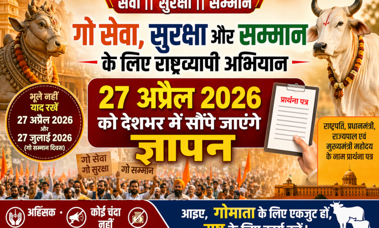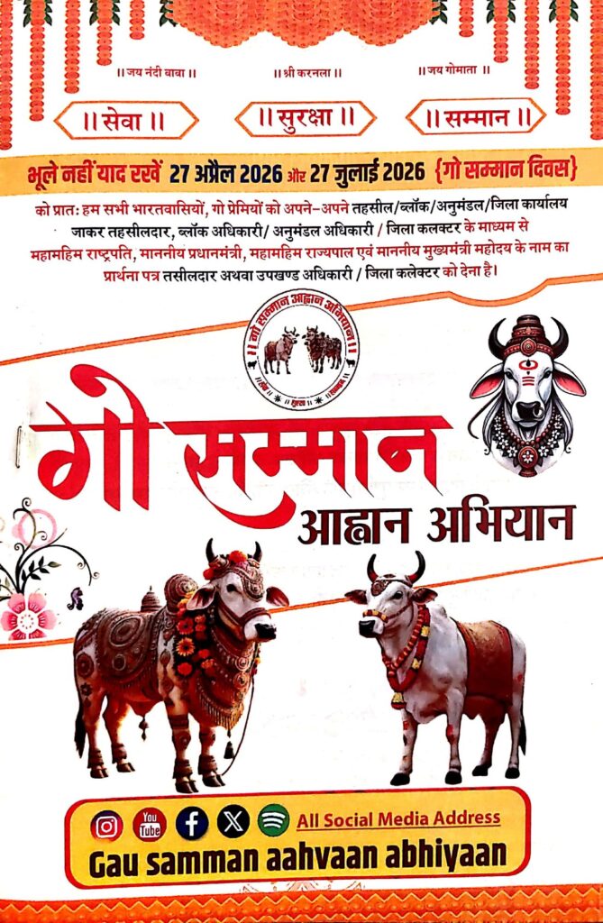 देशभर में गो सेवा, सुरक्षा और सम्मान को लेकर एक व्यापक जनअभियान शुरू किया जा रहा है, जिसका उद्देश्य गोवंश संरक्षण से जुड़े मुद्दों को शासन और प्रशासन के सामने संगठित रूप से रखना है। “गो सम्मान आह्वान अभियान” के नाम से चल रहे इस प्रयास के तहत 27 अप्रैल 2026 और 27 जुलाई 2026 को “गो सम्मान दिवस” के रूप में मनाने का आह्वान किया गया है।
