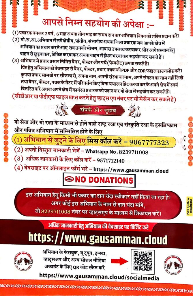 अभियान में किसी भी प्रकार का चंदा नहीं लिया जाएगा और केवल गोमाता और नंदी के चित्रों का ही उपयोग प्रचार सामग्री में किया जाएगा।