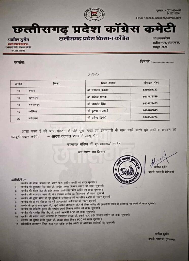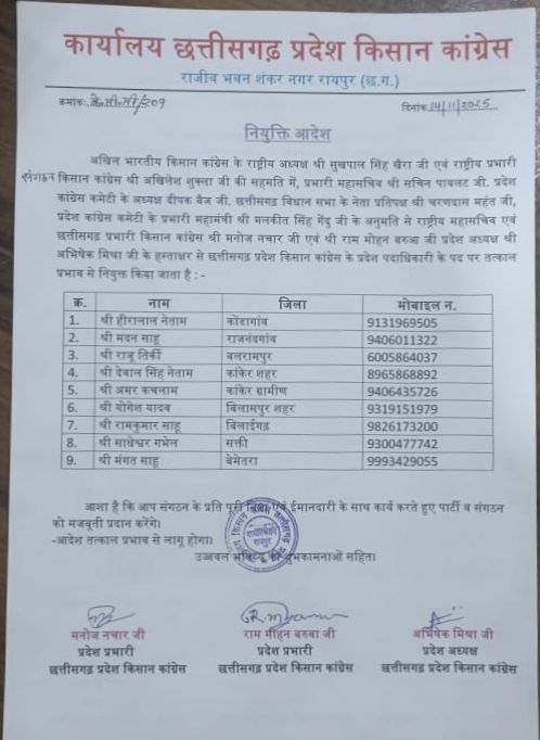 पहले आदेश में बस्तर, सूरजपुर, बलरामपुर, कोरिया और मनेंद्रगढ़ के जिलाध्यक्षों की नियुक्तियां साफ तरीके से घोषित की गई थीं। इसके तुरंत बाद दूसरे आदेश का आ जाना यह संकेत देता है कि किसान कांग्रेस की कार्यशैली खुद उसके नेतृत्व के नियंत्रण में नहीं दिख रही।