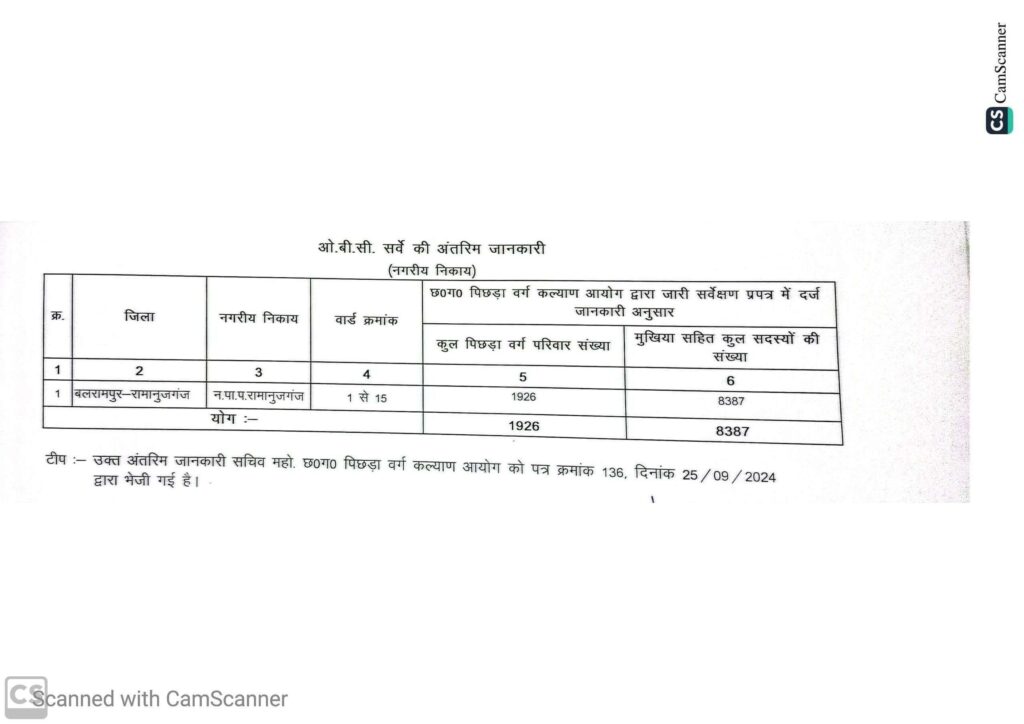ओबीसी वर्ग का सर्वे रिपोर्ट नगरी निकाय रामानुजगंज